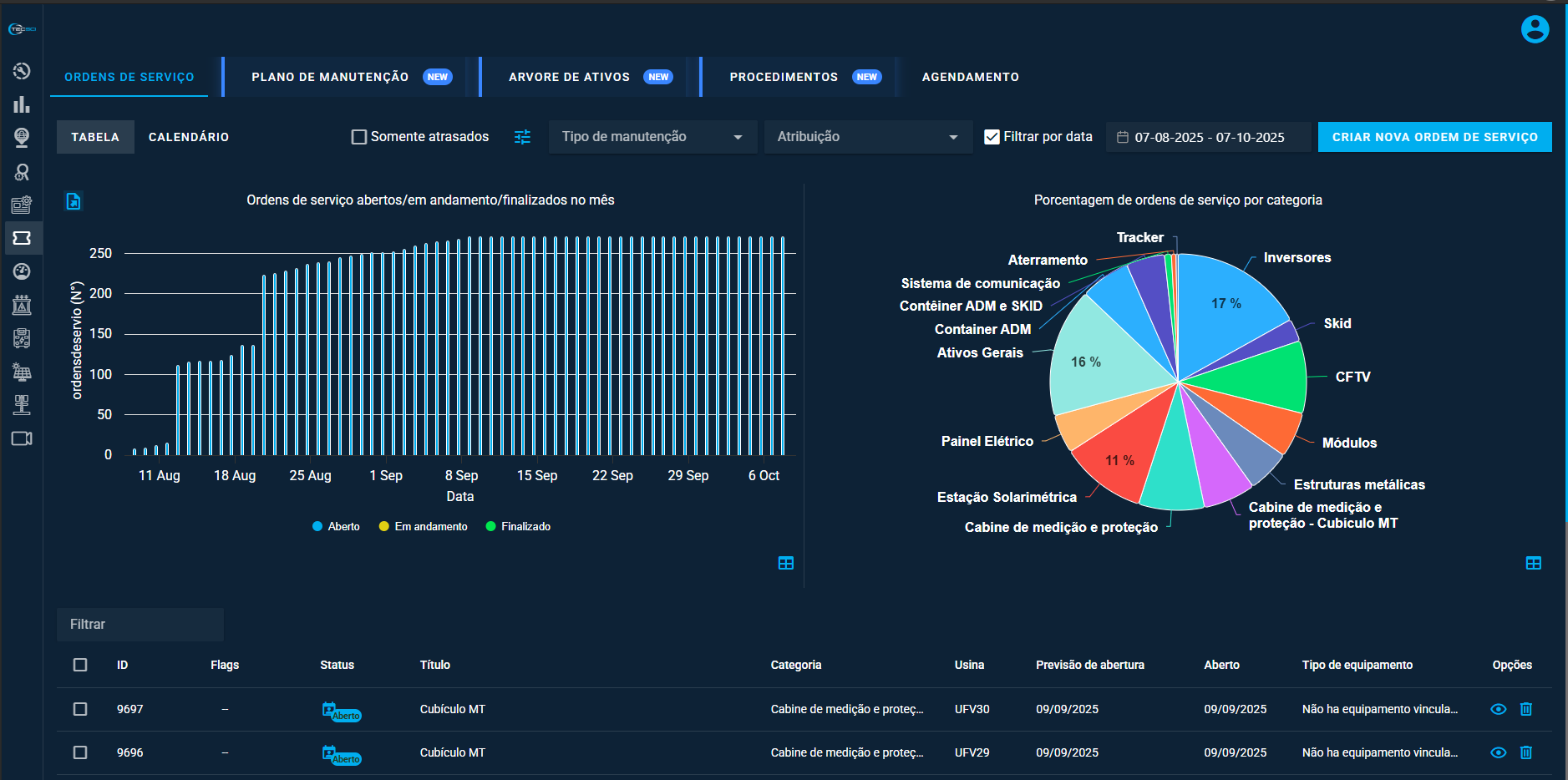 Crie e gerencie planos preventivos e corretivos de forma rápida. Com uma árvore completa de ativos e mais de 100 checklists de inspeção pré-configurados, o CMMS da TECSCI é desenvolvido especificamente para usinas solares, economizando tempo e garantindo padronização.